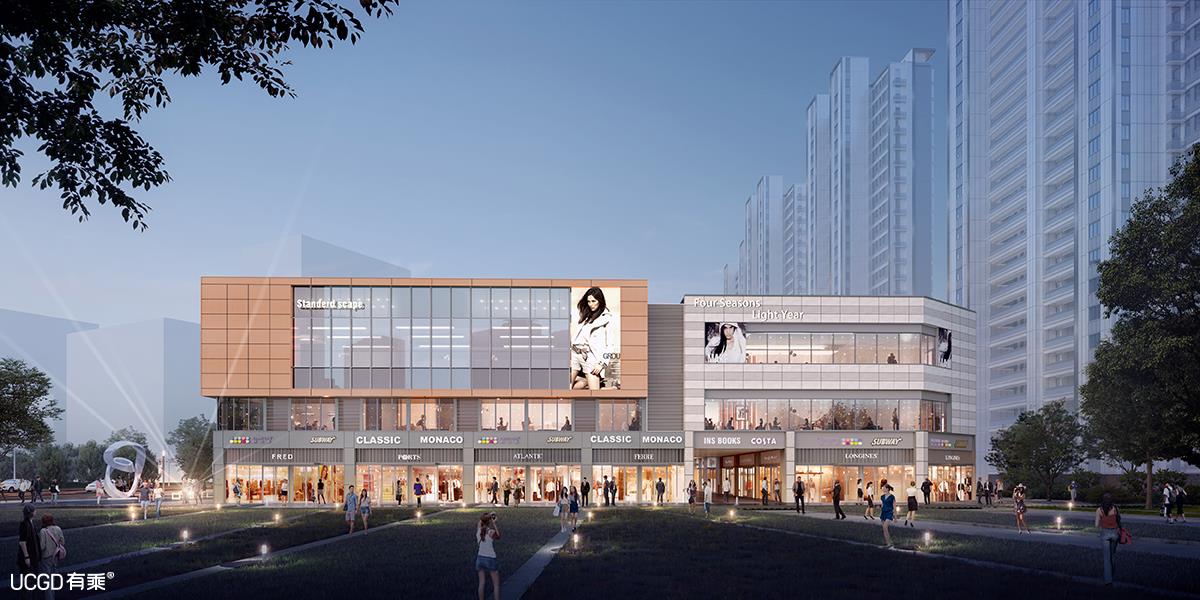 示范区为临时建筑,位于地块西侧临路规划绿地上。商业街设置于地块北侧,将东西两块规划绿地有机的串联在一起,形成公园-商业-公园的通畅流线。